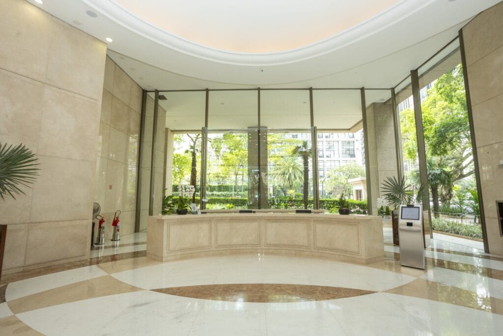 O hall de entrada climatizado oferece conforto térmico e uma recepção sofisticada, refletindo a identidade moderna e acolhedora do empreendimento desde o primeiro contato.