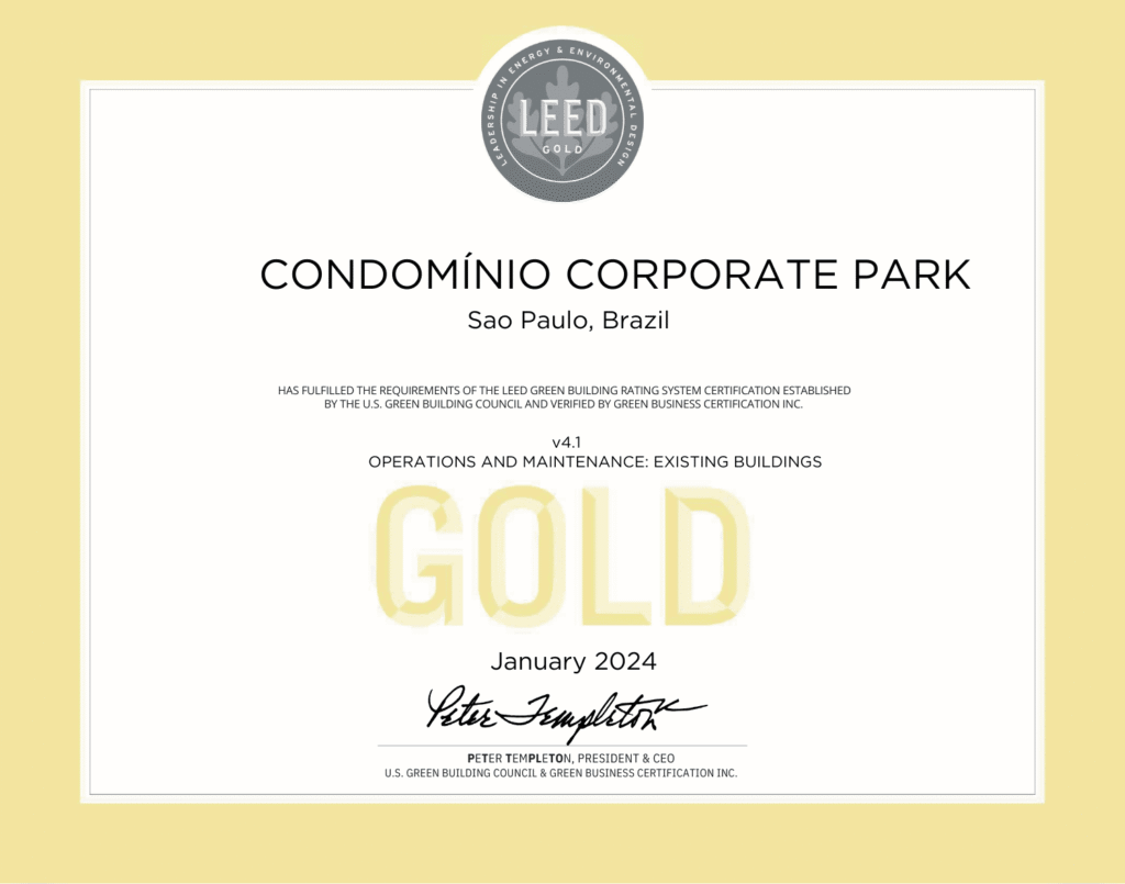 A certificação LEED é a certificação mais reconhecida do mundo voltada para as práticas ambientais sustentáveis nas edificações. No caso do Corporate Park, foi obtido o nível GOLD, que é o segundo mais alto da categoria. As principais premissas atendidas pela edificação para a obtenção da Certificação LEED-Gold são:
